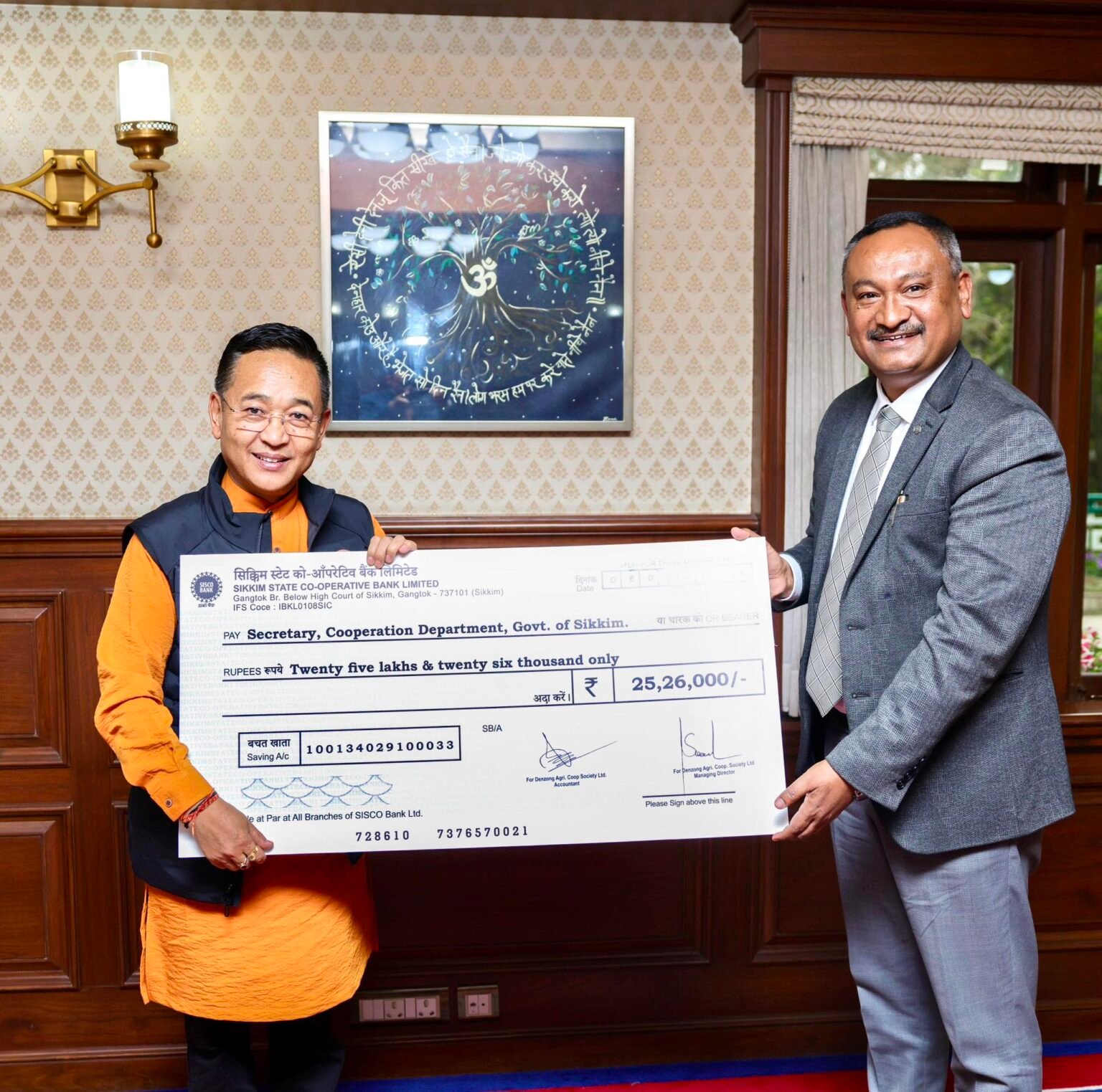 गान्तोक, 09 मार्च । डेन्जोङ कृषि सहकारी संस्था लिमिटेड (डीएसीएल) ले राज्य सरकारलाई २५ लाख २६ हजार रूपियॉंको लाभांश चेक प्रदान गरेको छ। डीएसीएसका प्रबन्ध निर्देशक धीरज प्रधानले मुख्यमन्त्री प्रेमसिंह तामाङलाई आज चेक हस्तान्तरण गरे।