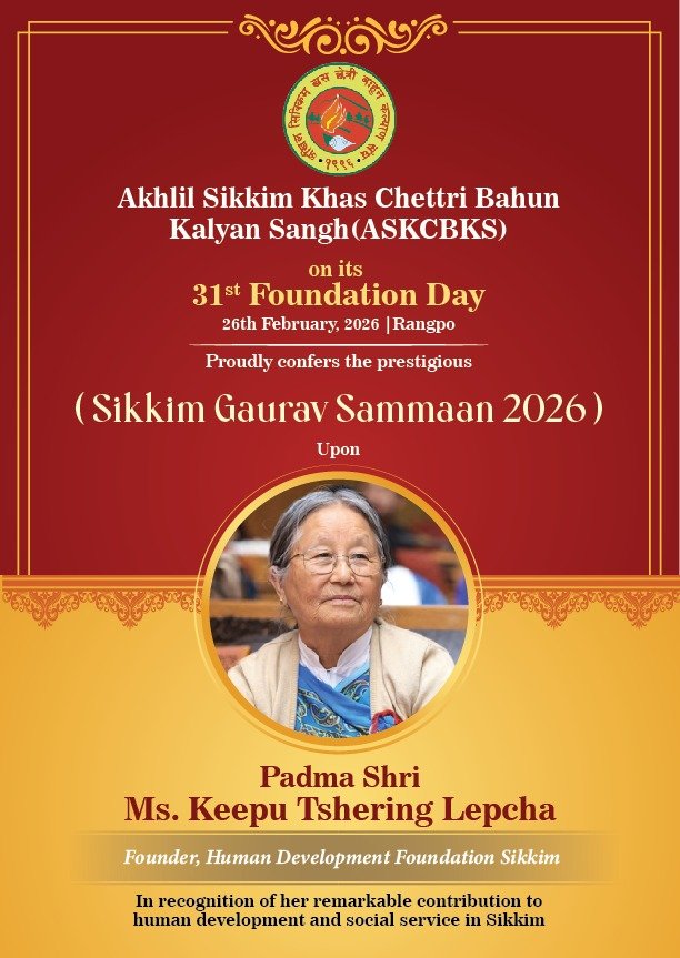गान्तोक, 23 फरवरी । अखिल सिक्किम खस छेत्री बाहुन कल्याण संघले आगामी 26 फरवरीका दिन रम्फू खेल मैदानमा आयोजना गर्ने आफ्नो ३१औं स्थापना दिवस समारोहमा ह्युमन डेभलपमेन्ट फाउण्डेशन अफ् सिक्किमकी संस्थापक पद्मश्रीले सम्मानित किपु छिरिङ लेप्चालाई प्रतिष्ठित ‘सिक्किम गौरव सम्मान 2026’ ले अभिनन्दित गर्ने भएको छ। यो सम्मान मानव विकास, सामाजिक उत्थान र सिक्किमका जनताप्रति उनको दशकौंको समर्पित सेवामा उत्कृष्ट योगदानको सम्मानमा प्रदान गरिने बताइएको छ।