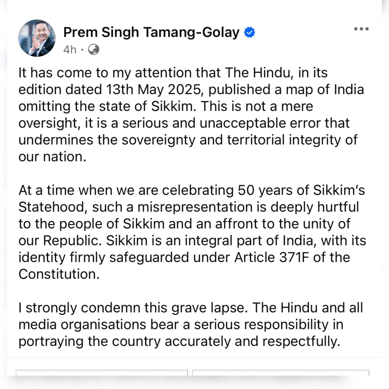 गान्तोक, 14 मई। मुख्यमन्त्री प्रेमसिंह तामाङले राष्ट्रिय समाचार पत्र ‘द हिन्दू’ को 13 मई, 2025 को संस्करणमा भारतको मानचित्रबाट सिक्किम राज्यलाई हटाएकोमा प्रतिक्रिया जनाएका छन्। उनले यो केवल भूल मात्र होइन, यो राष्ट्रको सार्वभौमिकता र क्षेत्रीय अखण्डतालाई कमजोर पार्ने गम्भीर र अस्वीकार्य त्रुटि रहेको बताएका छन्।