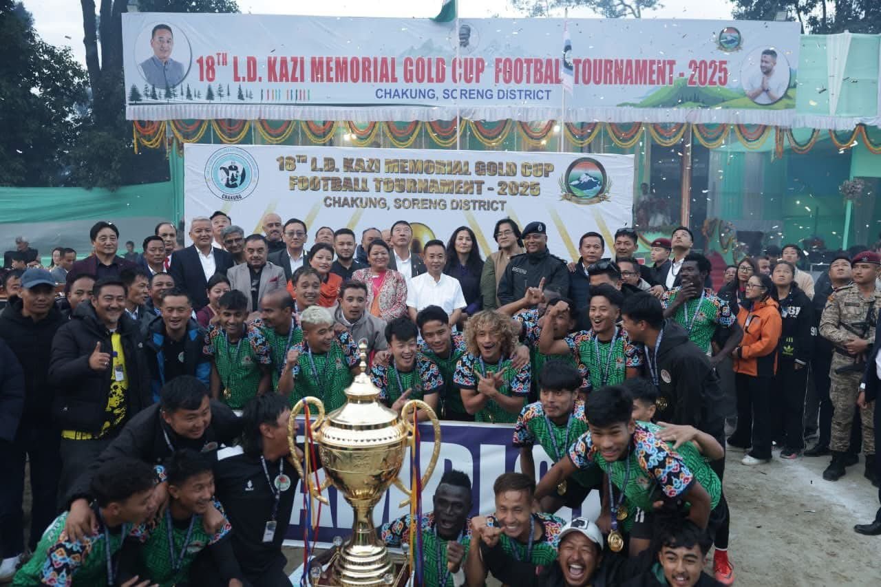 सोरेङ, 8 नोभेम्बर। सिङलिङ एससी (सोरेङ) 18औं स्वर्गीय एलडी काजी स्मारक स्वर्ण कप फुटबल प्रतियोगिताको च्याम्पियन बनेको छ। च्याखुङ खेलमैदानमा आज खेलिएको फाइनल खेलमा सिङलिङ एससीले प्रतिद्वन्दी दल याङथाङ युनाइटेड (गेजिङ) लाई 2-1 गोलले पराजित गरेर उपाधि आफ्नो नाम गऱ्यो।